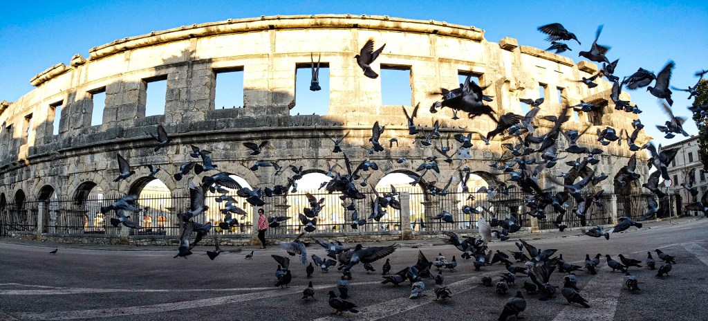 We are due to take a ferry from Venice to the Croatian port of Pula, but bad weather means we do the journey by bus. We arrive in the dark, but wake up to clear skies and the most magnificent Roman amphitheatre right on our doorstep.