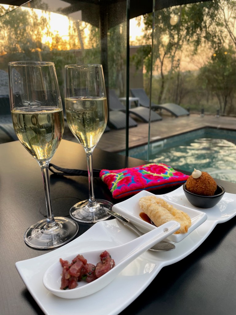 Later that afternoon we are back at the lodge, enjoying pre-dinner canapes on the outdoor deck, watching the light turn gold, and listening to the song of the cicadas. It’s the build-up – the bush is dry, storm clouds are high in the pink sky, and it feels like the entire gorge is anxiously waiting for the rains to begin.