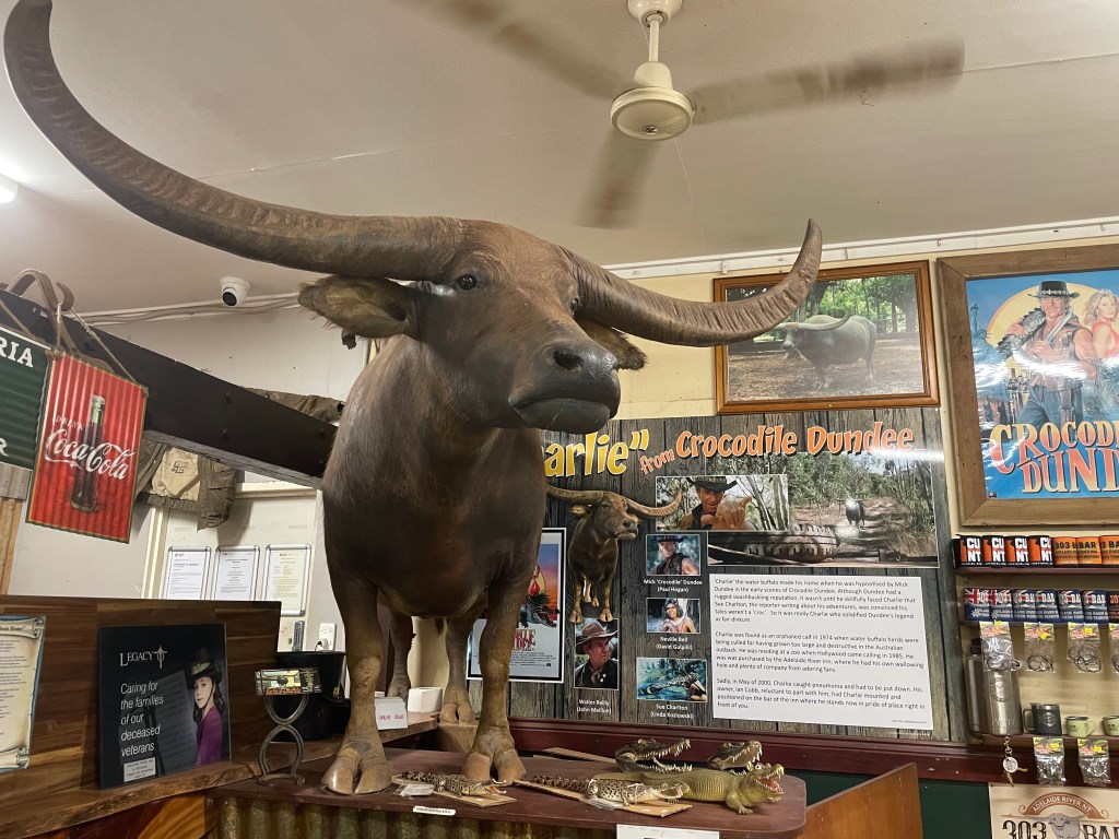 It’s November, well outside peak tourist season in the NT when we visit, so we’re up early and on the road to Nitmiluk National Park before the temperature starts to soar. First stop is Adelaide River – a pretty town, a little over an hour outside Darwin. Just 250 people live here now, but the town played a crucial role during WWII. A rest camp and farm were initially set up here, then Darwin came under attack, and Adelaide River became the base for communications, transport and ammunition storage. These days, the iconic Adelaide River Inn is the main attraction. Set among palms and poincianas, it is crammed with memorabilia, including a stuffed water buffalo (that featured in the Crocodile Dundee movie) as well as a five-metre crocodile. If I ever needed a reason to stay out of the water around here, Jock the Croc is a very good one.